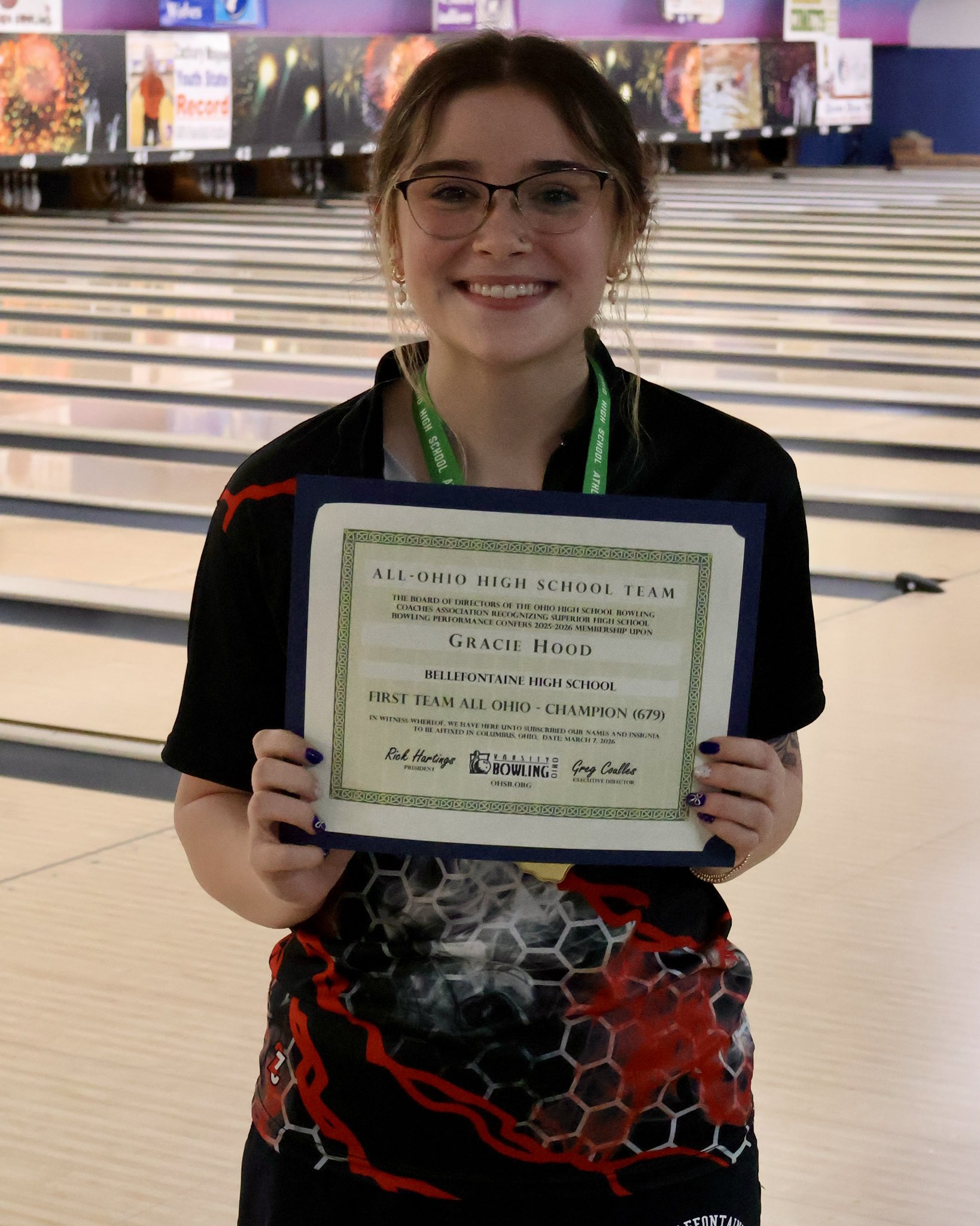 Congratulations to Gracie Hood from Bellefontaine. Gracie was the 2026 Girls Bowling Division I Individual State Champion! She rolled a 679 series (208-248-223) to win the title. Congratulations Gracie!!